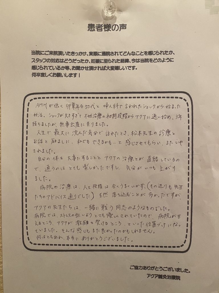 ショックが大きすぎて不妊治療の初期段階からアクアに通い始め、3年経ちましたが、無事出産に至りました。