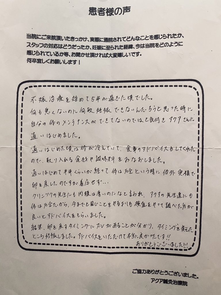 何も悪くないのになぜ妊娠できないんだろうと思った時に自分のメンテナンスができてないのではと思いアクアさんに通院し始めました。