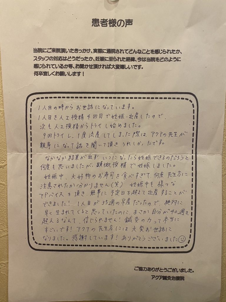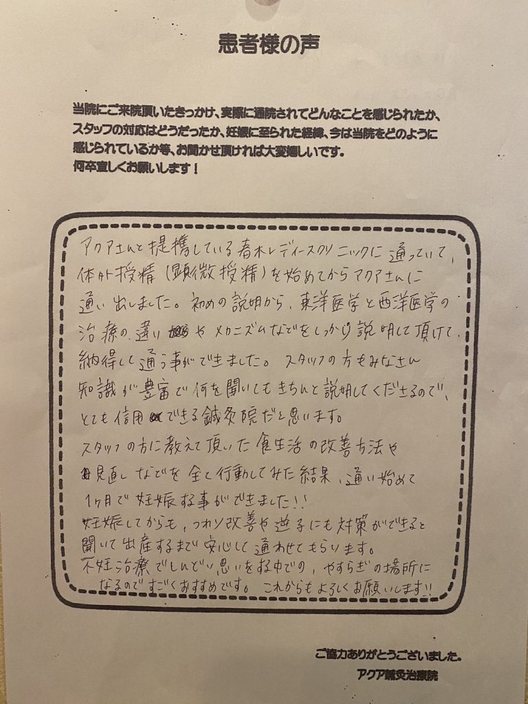 アクアさんと提携している春木レディースクリニックに通っていて、体外受精(顕微授精)を始めてからこちらの鍼灸院に通い始めました。