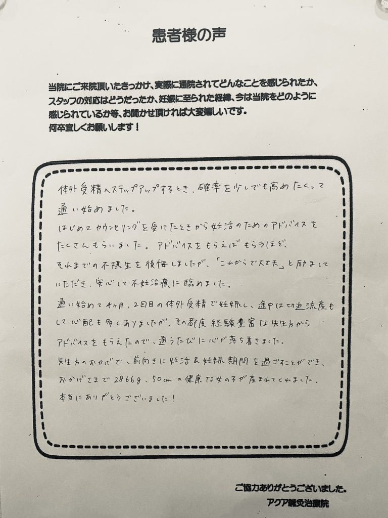 9回トライし、1度流産してしまった際はアクアの先生が親身になって話を聞いて頂きうれしかったです。