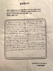 アクアでは治療だけでなく、日常からすぐに取り入れられる食生活のアドバイスを受けられたり、初めての治療の前には丁寧な面談があったり、その時の身体の不調やちょっとした悩みを気軽に相談できる環境で、とても精神的にも助けられていました。