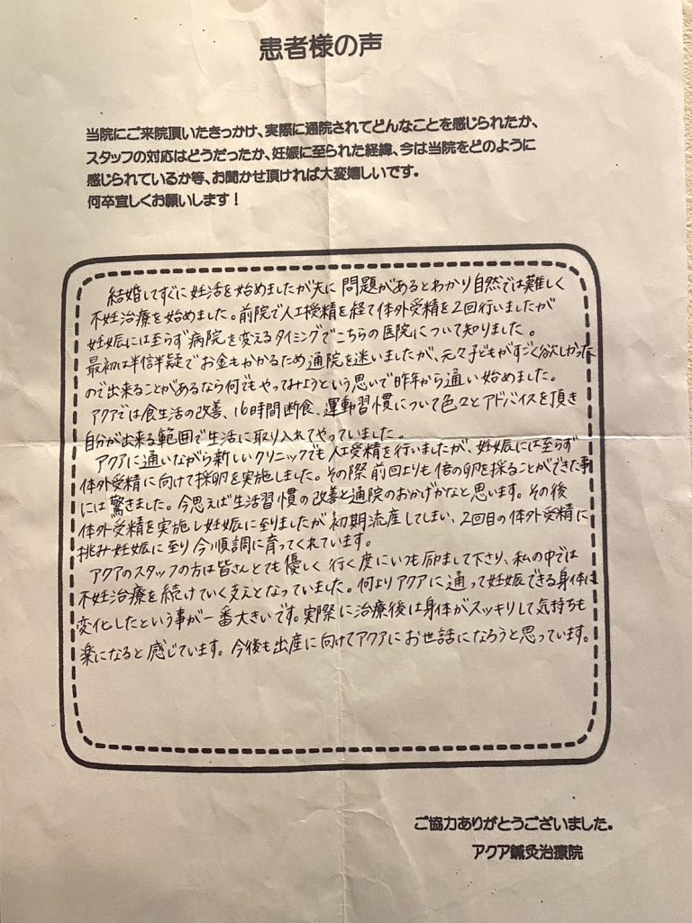 初めてアクアに来た時、“3か月で効果が出ます。”と言って頂いたあの日からちょうど4か月、妊娠できない原因を知りたかったために受けた初めての体外受精で無事、妊娠の陽性が出ました。