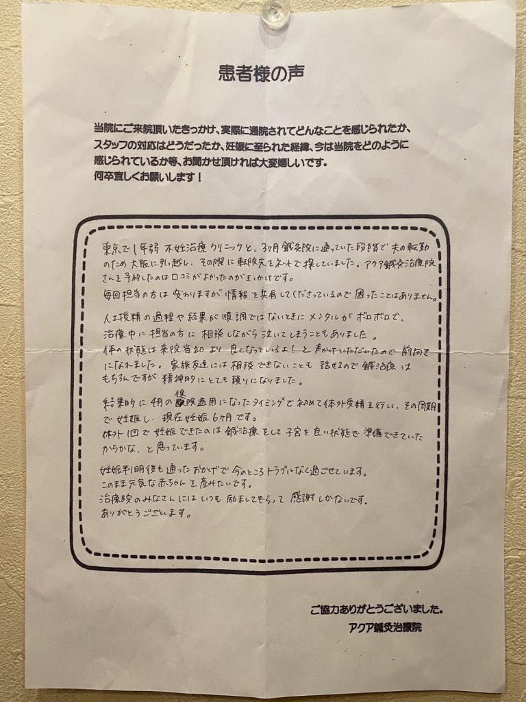 鍼灸はなかなか手が出せずにいましたが、IVFの話が出た事で自分の中で決心がつき、通院しやすい為、アクアさんにお世話になる事になりました。