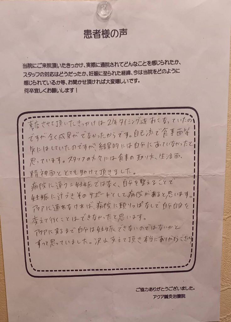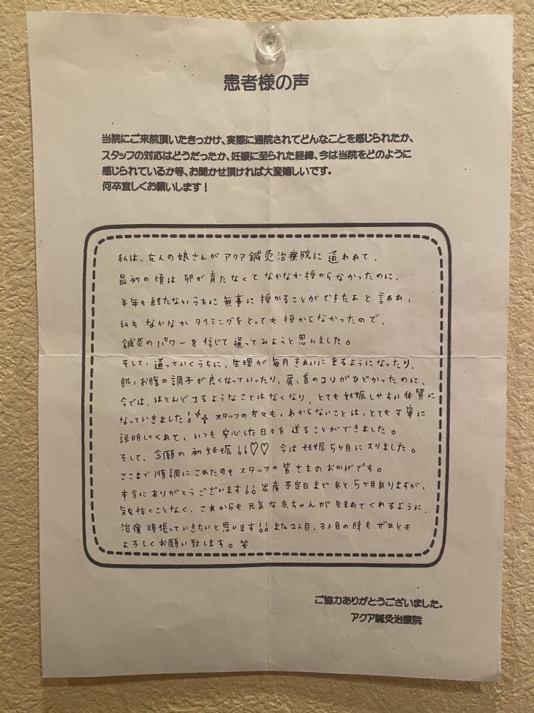 私は、友人の娘さんがアクア鍼灸治療院に通われて、最初の頃は卵が育たなくてなかなか授からなかったのに、半年も経たないうちに無事に授かることができたよと言われ、私もなかなかタイミングをとっても授からなかったので、鍼灸のパワーを信じて通ってみようと思いました。