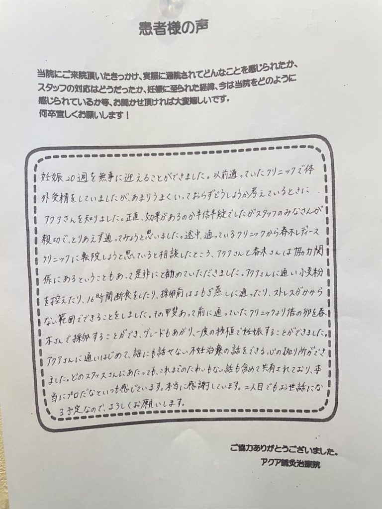 途中、通っているクリニックから春木レディースクリニックさんに転院しようと思っていると相談したところ、アクアさんと春木さんは協力関係にあるということもあって是非と勧めていただきました。