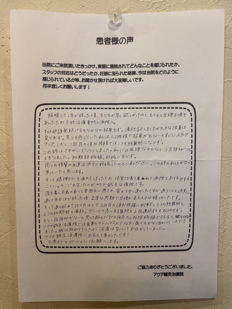 以前通っていたクリニックで体外受精をしていましたが、あまりうまくいっておらずどうしようか考えている時にアクアさんを知りました。正直、効果があるかは半信半疑でしたがスタッフのみなさんが親切でとりあえず通ってみようと思いました。