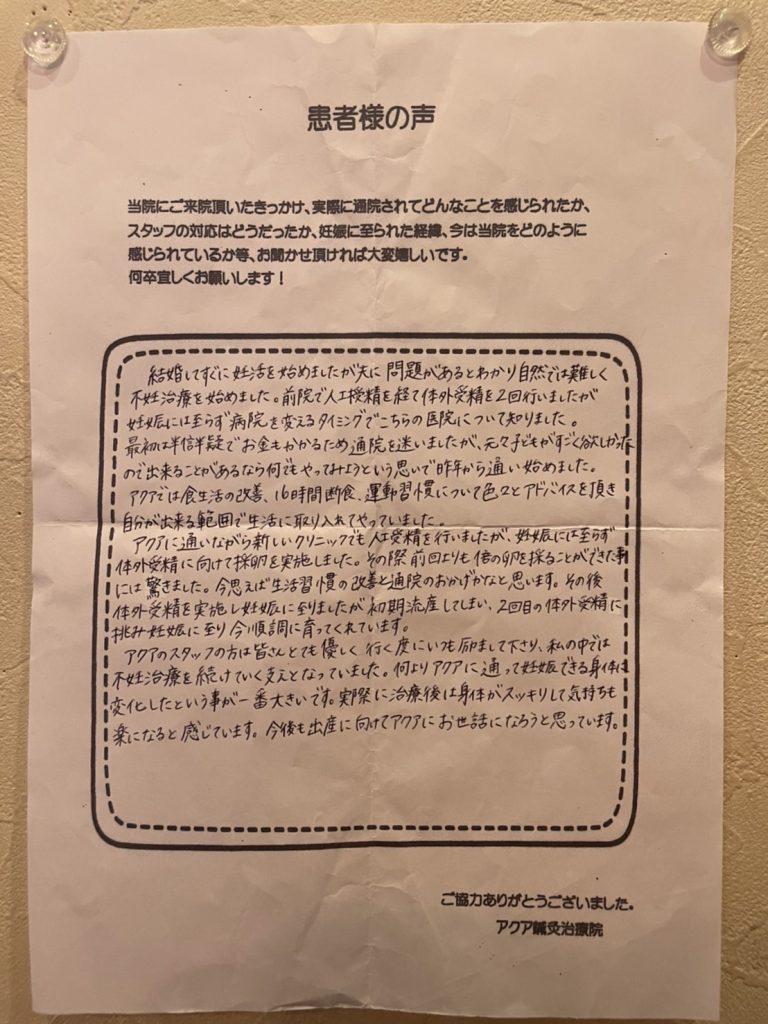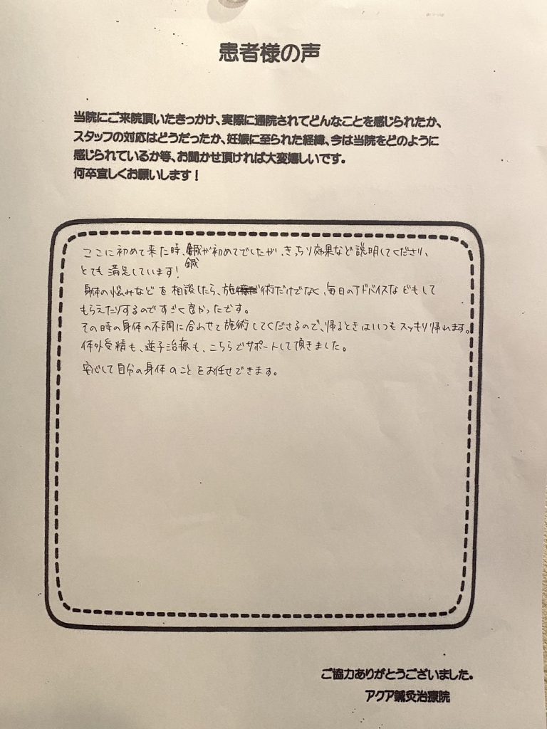 結婚してすぐに妊活を始めましたが夫に問題があるとわかり自然では難しく不妊治療を始めました。 前院で人工授精を経て体外受精を2回行いましたが妊娠には至らず病院を変えるタイミングでこちらの医院について知りました。最初は半身半疑でお金もかかるため通院を迷いましたが、元々子どもがすごくほしかったので出来ることがあるならなんでもやってみようという思いで昨年から通い始めました。 アクアでは食生活の改善、16時間断食、運動習慣について色々とアドバイスをいただき自分ができる範囲で生活に取り入れてやっていました。 アクアに通いながら新しいクリニックでも人工授精を行いましたが妊娠には至らず体外受精に向けて採卵を実施しました。その際前回よりも倍の卵を採ることができた事には驚きました。生活習慣の改善と通院のおかげかなと今では思います。 その後体外受精を実施し妊娠に至りましたが初期流産してしまい、2回目の体外受精に挑み妊娠に至り今順調に育ってくれています。 アクアのスタッフの方は皆さんとても優しく行くたびにいつも励まして下さり、私の中では不妊治療を続けていく支えとなっていました。何よりアクアに通って妊娠できる身体に変化したという事が一番大きいです。実際に治療後は身体がスッキリして気持ちも楽になると感じています。今後も出産に向けてアクアにお世話になろうと思っています。