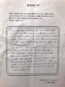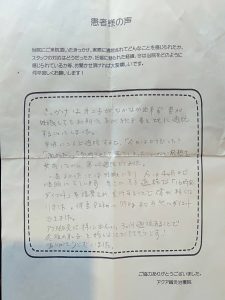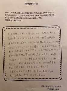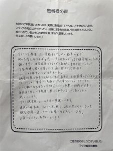 いつも治療後は心もおだやかにすごせ、あきらめずにがんばろうという気持ちになれました。