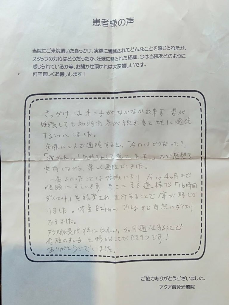 結婚して2年、35才でなかなか授からず病院で検査をしても特に異常はありませんでした。しかしタイミング6回、人工授精1回しても結果がでなかった為、体質改善をしようと思いアクアさんで鍼灸治療を受けてみました。すると今までストイックにダイエットをしないと落ちなかった体重が4ヶ月で8㎏もみるみると落ちました。そして体がずっと重だるく倦怠感があったのがなくなり、腰痛も改善されました。鍼灸治療はもちろん、食生活や睡眠、運動の大切さをたくさんアドバイスして頂き、とても勉強になりました。通院をはじめ約半年くらいで体外受精を行いおかげさまで無事妊娠することができました。現在5ヶ月になりましたが、体調を整える為と通院していないとついつい気がゆるみ不摂生をしてしまうので、続けて鍼灸をして頂いております。なにより先生方とのお話が楽しく、気持ちも元気にして頂いており、癒やされとても感謝しております。本当にいつもありがとうございます。