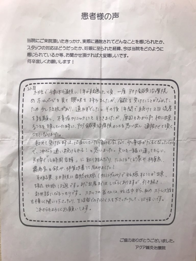 現在妊娠9ヶ月、悪阻も全く無く、元気に過ごせているのも鍼灸治療のお陰かなと思っています。