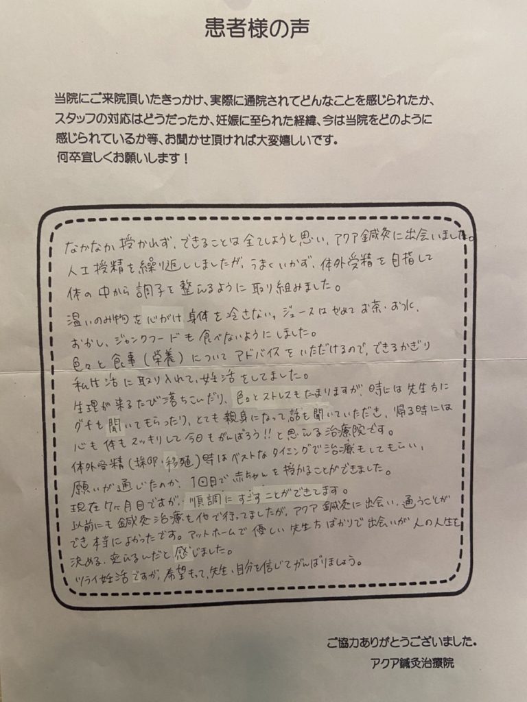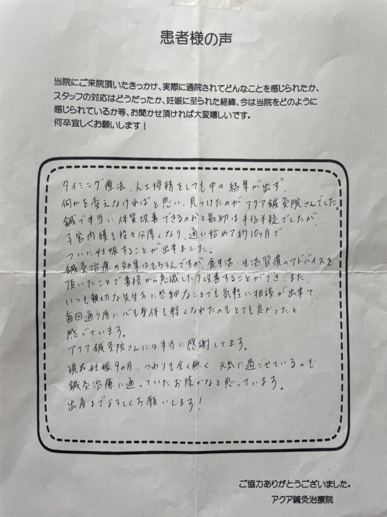 なかなか授かれず、できることは全てしようと思い、アクア鍼灸に出会いました。人工授精を繰り返しましたが、うまくいかず、体外受精を目指して体の中から調子を整えるように取り組みました。温かい飲み物を心がけ身体を冷やさない、ジュースはやめてお茶、お水、おかし、ジャンクフードも食べないようにしました。色々と食事(栄養)についてアドバイスをいただけるので、できるかぎり私生活に取り入れて、妊活をしていました。生理が来るたび落ち込んだり、色々とストレスもたまりますが、時には先生方にグチも聞いてもらったり、とても親身になって、話を聞いていただき、帰る時には心も体もスッキリして今日もがんばろう!!と思える治療院です。体外受精(採卵・移植)時はベストなタイミングで治療をしてもらい、願いが通じたのか、1回目で赤ちゃんを授かることができました。現在7か月目ですが、順調にすごすことができてます。以前にも鍼灸治療を他で行ってましたが、アクア鍼灸に出会い、通うことができ本当によかったです。アットホームで優しい先生方ばかりで出会いが人の人生を決める、変えるんだと感じました。ツライ妊活ですが、希望をもって先生・自分を信じて頑張りましょう。