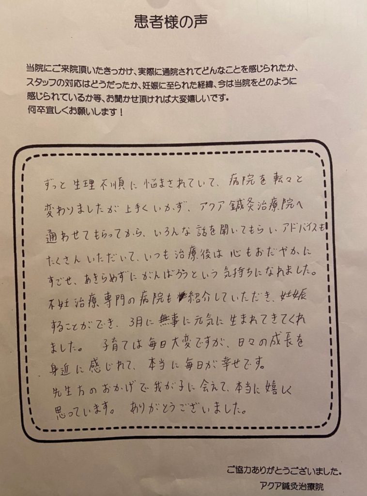 アクア鍼灸院様に出会い3ヶ月通院することで念願の第二子を授かることができそうです。ありがとうございました!