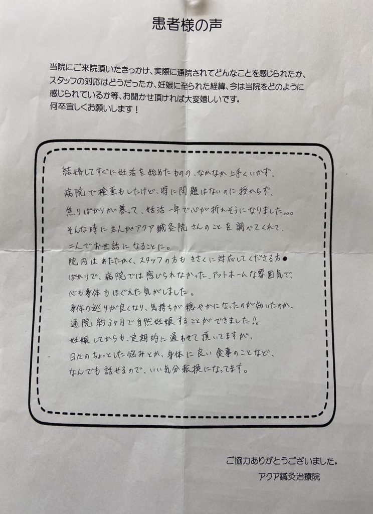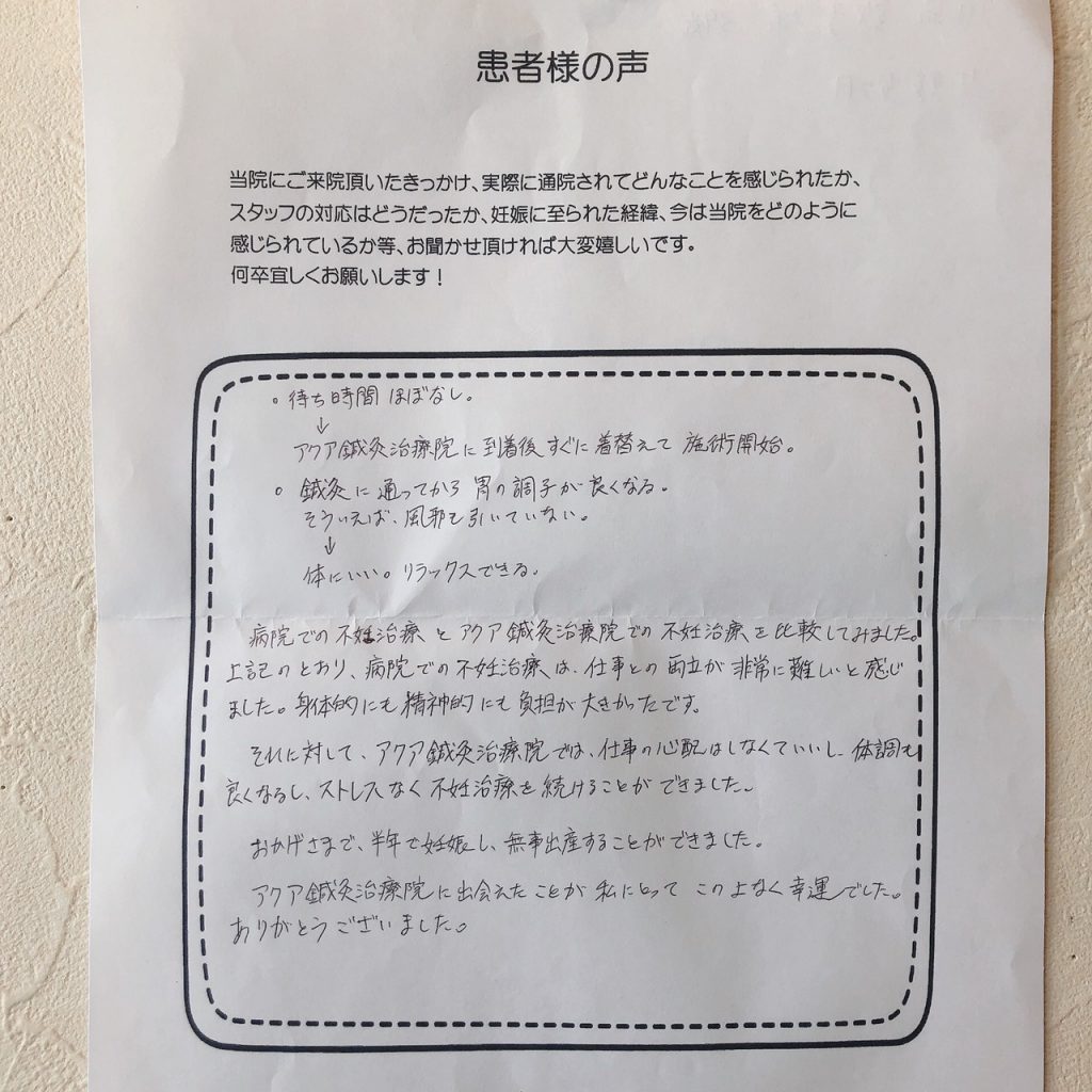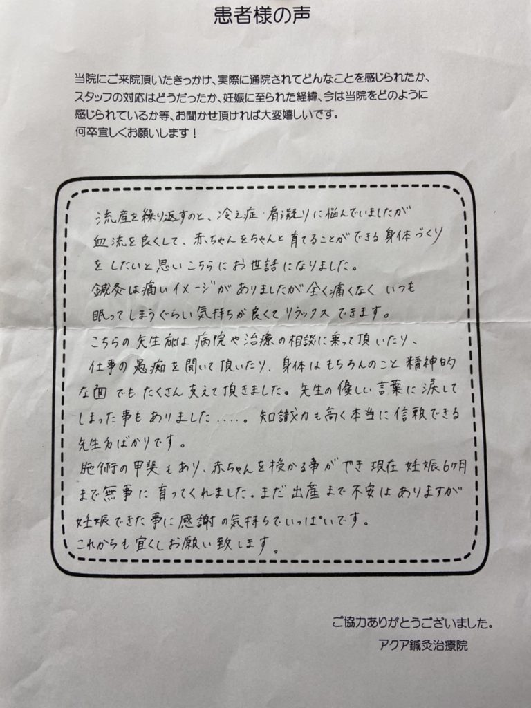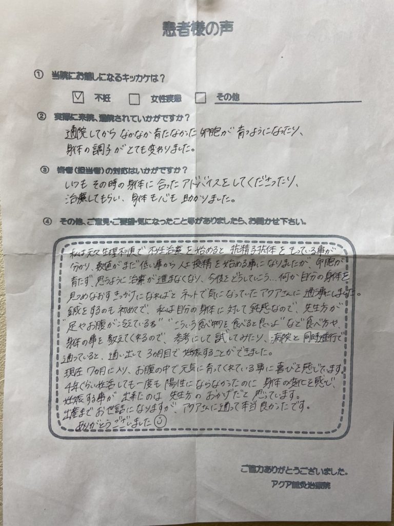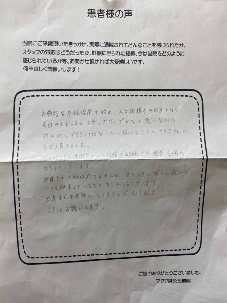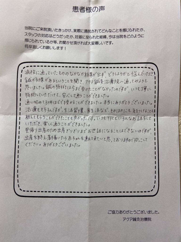 私は元々生理不順で不妊治療を始めると、抗精子抗体をもっている事がわかり、数値がまだ低い事から人工授精を始める事になりましたが、卵胞が育たず、思うように治療が進まなくなり、今後をどうしていこう、、、何か自分の身体を見つめなおすきっかけになればとネットで気になっていたアクアさんに通う事にしました。鍼をするのも初めてで私は自分の身体に対して鈍感なので、先生方が「足やお腹が冷えているね」「こういう食べ物を食べると良いよ」など食べ方や身体の事を教えてくれるので、参考にして試してみたり、病院と同時進行で通っていると、通いだして3カ月目で妊娠することができました。現在7カ月に入り、お腹の中で元気に育ってくれている事に喜びを感じています。4年ぐらい妊活しても一度も陽性にならなかったのに身体の変化を感じ、妊娠する事が出来たのは先生方のおかげだと思っています。出産までお世話になりますが、アクアさんに通って本当に良かったです。ありがとうございました(*^^*)
