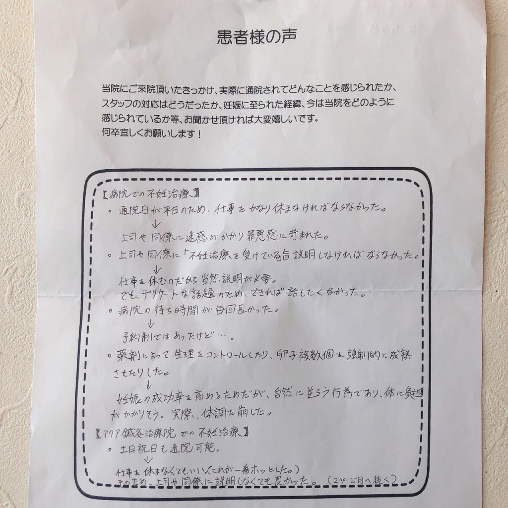 本格的な不妊治療を始め、人工授精も4回目となり、今回ダメだったらステップアップかなと思いながら、何か他にできることはないかと調べるうちにアクアさんにたどり着きました。おかげさまで、4回目の人工授精で妊娠でき、現在6ヶ月になろうとしています。出産まで心配は尽きませんが、スタッフの皆さん親切で、いつも励ましていただき、ありがとうございます。出産までお世話になりますので、引き続きよろしくお願いします。
