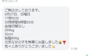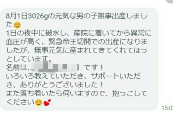 8月1日3026gの元気な男の子無事出産しました。1日の夜中に破水し、産院に着いてから異常に血圧が高く、緊急帝王切開での出産になりましたが、無事元気に産まれてきてくれてほっとしています。名前は、Aくんです!いろいろ教えていただき、サポートいただき、ありがとうございました!また落ち着いたら伺いますので、抱っこしてください。
