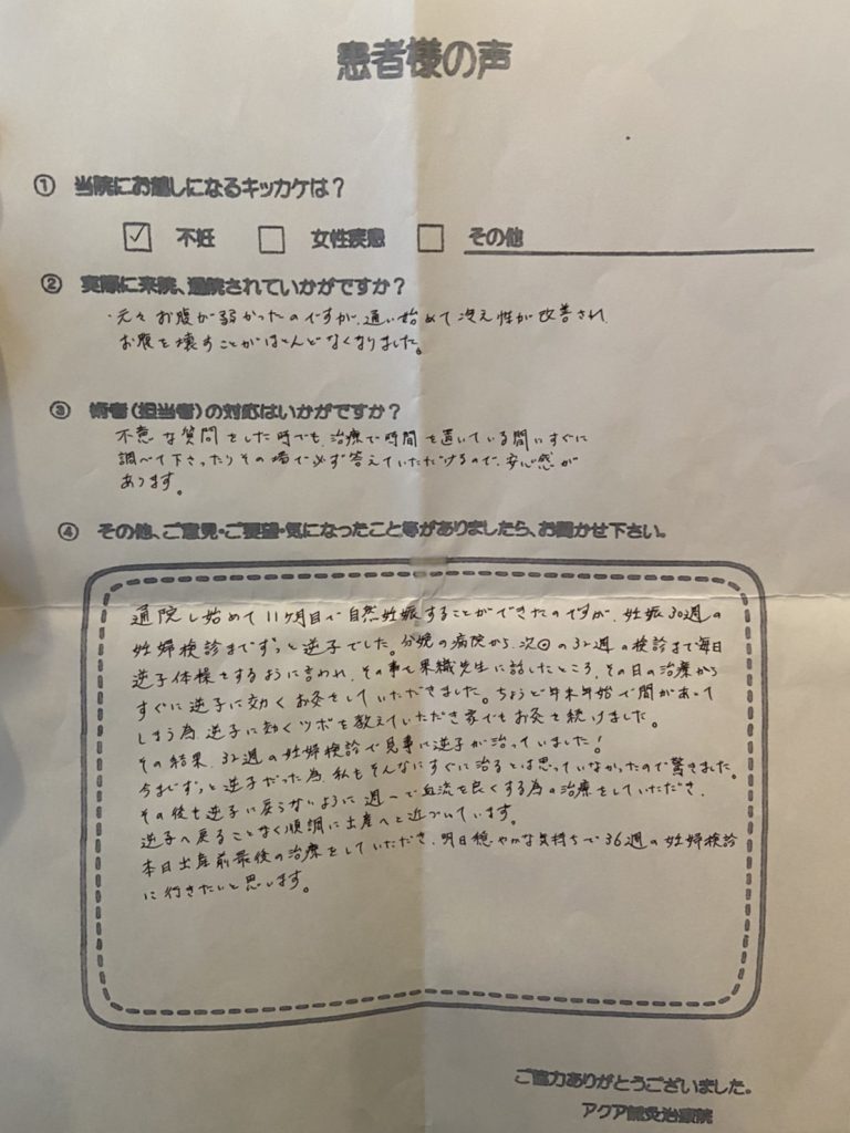 通院し始め11ヶ月目で自然妊娠することができたのですが、妊娠30週の妊婦検診までずっと逆子でした。分娩の病院から次回の32週の検診まで毎日逆子体操をするように言われ、その事を果織先生に話したところ、その日の治療からすぐに逆子に効くお灸をしていただき家でもお灸を続けました。その結果、32週の妊婦検診で見事に逆子が治っていました! 今までずっと逆子だった為、私もそんなにすぐに治るとは思っていなかったので驚きました。その後も逆子が戻ることなく順調に出産へと近づいています。 本日出産前最後の治療をしていただき、明日穏やかな気持ちで36週の妊婦検診に行きたいと思います。