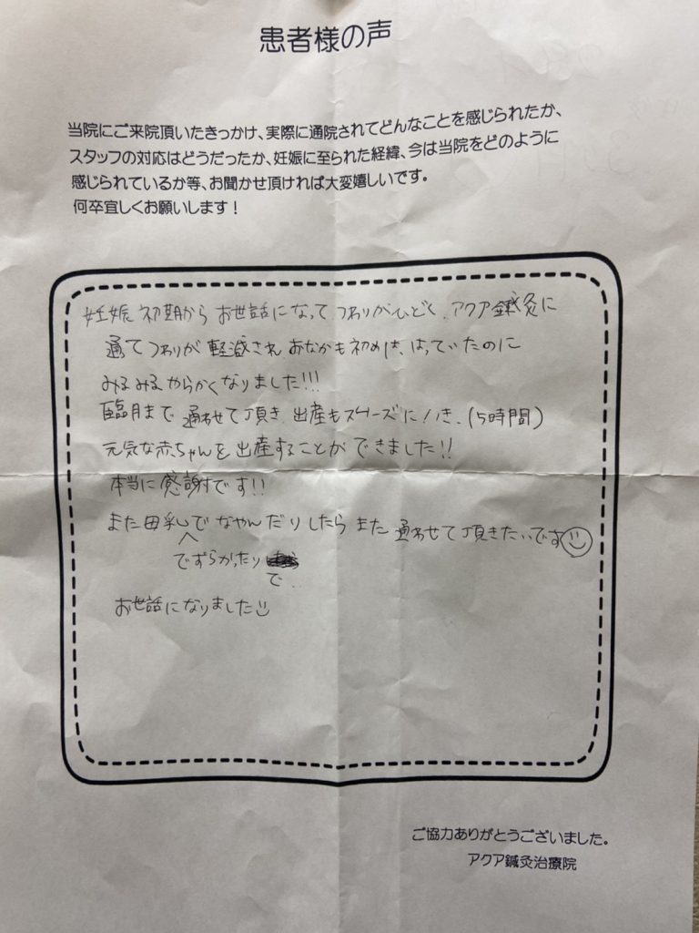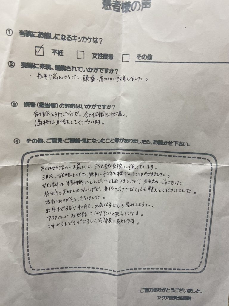 私は妊活の一環として、アクア鍼灸院に通っています。現在、妊娠6ヶ月で、無事に子どもを授かる事ができました。妊活中は、精神的にしんどいこともありましたが、先生方の心のこもった施術と励ましのおかげで身体だけでなく心も整えてくださいました。本当にありがとうございました。出産まで残り4か月も、元気な子どもを産めるように、アクアさんにお世話になろうと思っています。これからもどうぞよろしくお願いします。