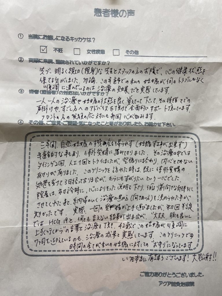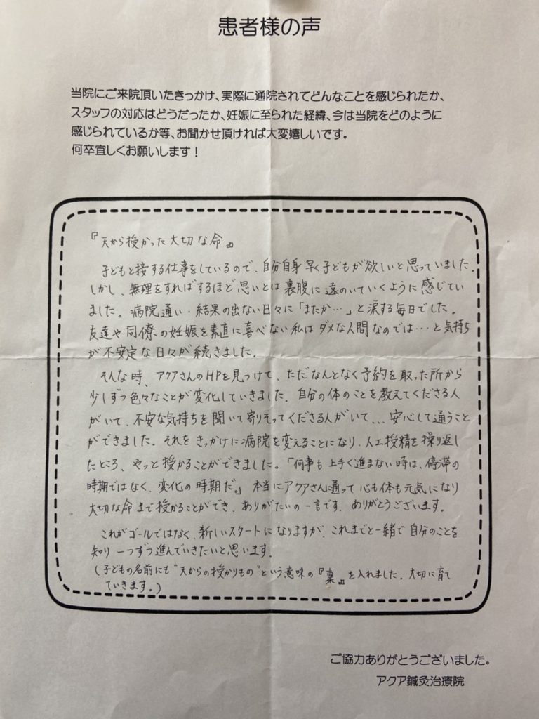 子どもと接する仕事をしているので、自分自身早く子どもが欲しいと思っていました。しかし、無理をすればするほど思いとは裏腹に遠のいていくように感じていました。病院通い・結果の出ない日々に「またか…」と涙する毎日でした。友達や同僚の妊娠を素直に喜べない私はダメな人間なのでは…と気持ちが不安定な日々が続きました。そんな時、アクアさんのHPを見つけて、ただなんとなく予約を取った所から少しずつ色々なことが変化していきました。自分の体のことを教えてくださる人がいて、不安な気持ちを聞いて寄り添ってくださる人がいて…安心して通うことができました。それをきっかけに病院を変えることになり、人工授精を繰り返したところ、やっと授かることができました。「何事も上手く進まない時は、停滞の時期ではなく、変化の時期だ。」本当にアクアさんに通って心も体も元気になり大切な命まで授かることができ、ありがたいの一言です。ありがとうございます。