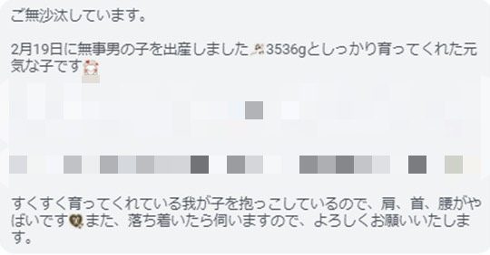 2月19日に無事男の子を出産しました。3536gとしっかり育ってくれた元気な子です。