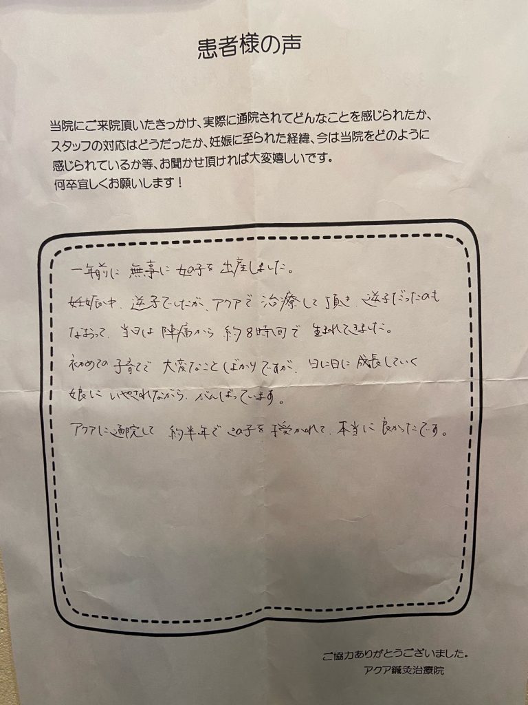 一年前に無事に女の子を出産しました。妊娠中、逆子でしたがアクアで治療して頂き逆子だったのもなおって当日は陣痛から約8時間で生まれてきました。 初めての子育てで大変なことばかりですが、日に日に成長していく娘にいやされながらがんばっています。 アクアに通院して約半年でこの子を授かれて本当に良かったです。