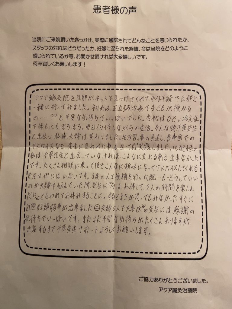 アクア鍼灸院を旦那がネットで見つけてくれて、半信半疑で旦那と一緒に行ってみました。初めは、正直鍼治療で子どもが授かるの・・・??と不安な気持ちでいっぱいでした。当初はひどい冷え性で体も心もぼろぼろ。毎日イライラしながらの生活。そんな時千草先生と出会い私達夫婦は、変わりました。生活習慣の見直し、食事面でのアドバイスなど、先生に言われた事は、全て即実践しました。心配性の私は、千草先生と出会っていなければ、こんな変わることは、出来なかったです。たくさん相談に乗って頂きこんなに親身になってアドバイスしてくれる先生は他にはいないです。三度の人工授精を行い心配・・・もーどうしていいのか夫婦で悩んでいた所、先生に「今はお休みして、2人の時間を楽しんだら」と言われてお休みすることに。するとまさか思ってもみなかったすぐに自然妊娠することができました(^^)夫婦2人で大喜び♡先生には感謝の気持ちでいっぱいです。まだまだ不安気持ちがたくさんありますが、出産するまで千草先生サポートお願いします。