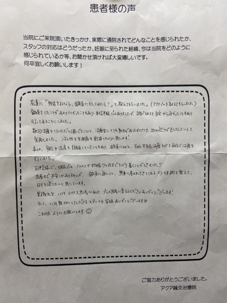 友達に「妊活をするなら、鍼灸に行ってみたら?」と教えてもらいました。(アクアさんを教えてもらいました)鍼灸をしたことがあまりなかったこともあり半信半疑ではありましたが、調べてみると自宅から近かったこともあり行ってみることにしました。 数回治療をしていただいて感じたことは、治療後にとても身体があったかくなり、血の巡りが良くなっていると実感しました。 冷え性も生理痛も軽減したように思います! 私は、年齢や流産を経験していたこともあり、鍼灸に加え、不妊・不育症治療HPと両方で治療を行いました。 お陰様で現在ではなんとか妊娠7ヶ月までたどり着くことができました!! 出産まで不安しかありませんが、鍼灸に通いつつ無事に産まれてきてくれるよう体調を整えて、日々を送りたいと思っています。 果織先生いつもマイナス思考な私をプラス思考に変えてくださりありがとうございます!そして、いつも親切にしてくださるスタッフの皆様ありがとうございます♡ これからもよろしくお願いします(*^^*)