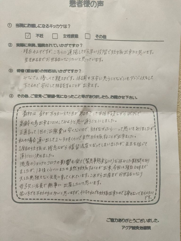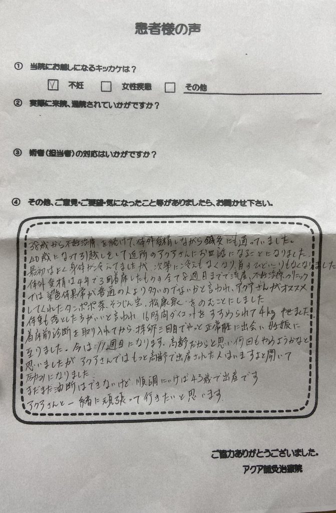 38歳から不妊治療を続けて体外受精しながら鍼灸にも通っていました。40歳になって引越しをして近所のアクアさんにお世話になることになりました。最初はよく身体が冷えてましたが、次第に冷えもなくなり、首のひどいこりもなくなりました。体外受精は4年で3回着床したものの全て8週目までで流産、不妊治療クリニックでは染色体異常が普通の人より多いのでないかと言われ、アクアさんがオススメしてくれたタンポポ茶、そうじん宝、松康泉をのむことにしました。体重も落とした方がいいと言われ、16時間ダイエットをすすめられて4㎏やせました。着床前診断を取り入れてから採卵三回目でやっと正常胚に出会い妊娠に至りました。今は11週目になります。高齢だからと思い何回もやめようかなと思いましたがアクアさんではもっと高齢で出産された人はいますよと聞いて励みになりました。まだまだ油断はできないけど順調にいけば43歳で出産です。アクアさんと一緒に頑張って行きたいと思います。