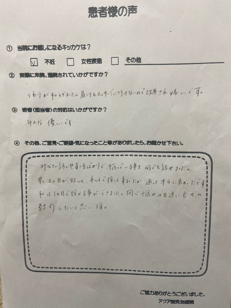 みなさん話しやすい方ばかりで、悩んでいる事を何でも話せました。早く2人目が欲しく、ネットで探して来ましたが通って本当に良かったです。私は1か月で授かる事ができました。同じ悩みの友達にもぜひ紹介したいと思います。