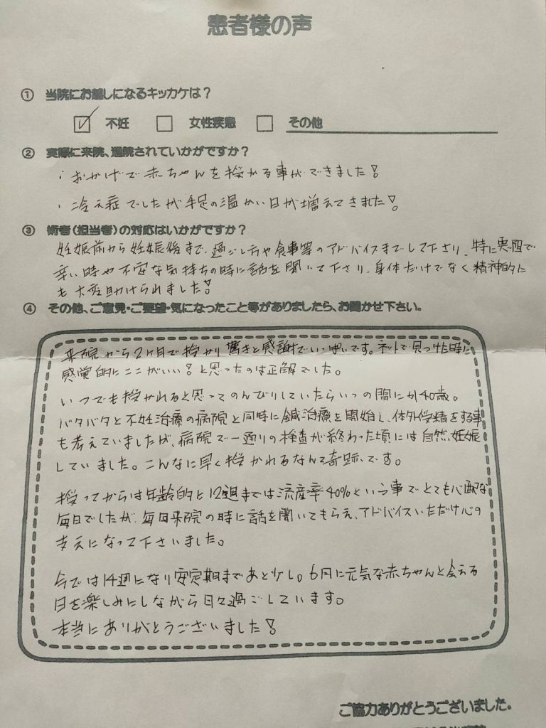 来院から2ケ月で授かり驚きと感謝でいっぱいです。ネットで見つけた時に感覚的にここがいい!と思ったのは正解でした。 いつでも授かれると思ってのんびりしていたらいつの間にか40歳。バタバタと不妊治療の病院と同時に鍼治療を開始し、体外受精をする事も考えていましたが、病院で一通りの検査が終わった頃には自然妊娠していました。こんなに早く授かれるなんて奇跡です。授かってからは年齢的に12週までは流産率が40%という事でとても心配な毎日でしたが、毎回来院の時に話を聞いてもらえ、アドバイスいただけ心の支えになって下さいました。今では14週になり安定期まであと少し。6月に元気な赤ちゃんと会える日を楽しみにしながら日々過ごしています。本当にありがとうございました。