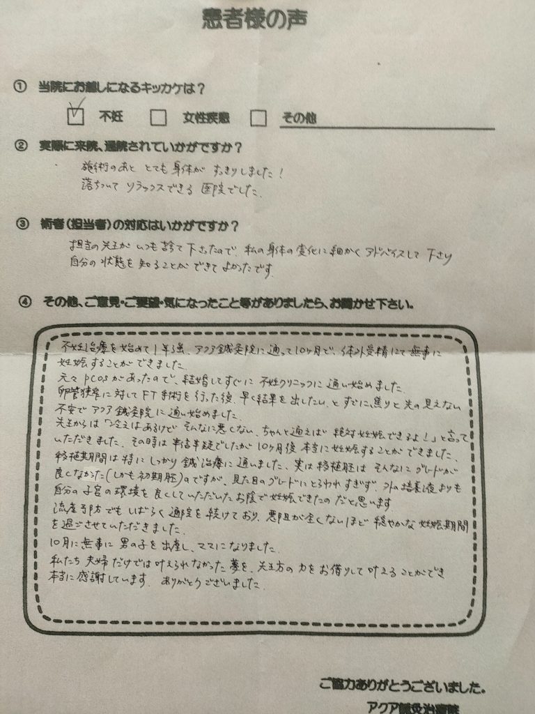 不妊治療を始めて1年強、アクア鍼灸院に通って10ヶ月で体外受精にて無事に妊娠することができました。 元々PCOSがあったので、結婚してすぐに不妊クリニックに通い始めました。卵管狭窄に対してFT手術を行った後、早く結果を出したいとすでに焦りと光の見えない不安でアクア鍼灸院に通い始めました。先生からは「冷えはあるけどそんなに悪くない、ちゃんと通えば絶対妊娠できるよ!」と言っていただきました。その時は半信半疑でしたが10カ月後本当に妊娠することができました。移植期間は特にしっかり鍼治療に通いました。実は移植胚はそんなにグレードが良くなかった(しかも初期胚)のですが、見た目のグレードにとらわれすぎず、外の培養液よりも自分の子宮の環境を良くしていただいたお陰で妊娠できたのだと思います。流産予防でもしばらく通院を続けており、悪阻が全くないほど穏やかな妊娠期間を過ごさせていただきました。10月に無事に男の子を出産し、ママになりました。私たち夫婦だけでは叶えられなかった夢を、先生方の力をお借りして叶えることができ本当に感謝しています。ありがとうございました。