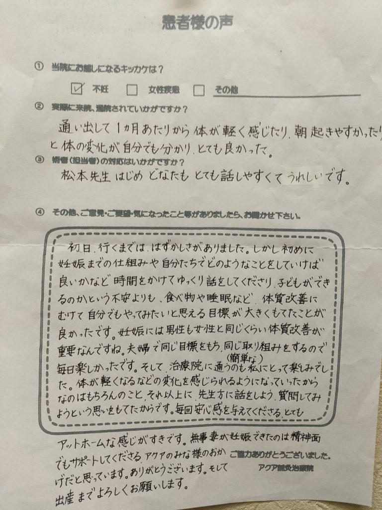 初日、行くまでははずかしさがありました。しかし初めに妊娠までの仕組みや自分たちでどのようなことをしていけば良いかなど時間をかけてゆっくり話をしてくださり、子どもができるのかという不安よりも、食べ物や睡眠など、体質改善にむけて自分でもやってみたいと思える目標が大きくもてたことが良かったです。妊娠には男性も女性と同じくらい体質改善が重要なんですね。夫婦で同じ目標をもち、同じ取り組みをするので毎日楽しかったです。そして、治療院に通うのも私にとって楽しみでした。体が軽くなるなどの変化を感じられるようになっていったからなのはもちろんのこと、それ以上に先生方に話をしよう質問してみようという思いをもてたからです。毎回安心感を与えてくださる、とてもアットホームな感じがすきです。無事妻が妊娠できたのは精神面でもサポートしてくださる、アクアのみな様のおかげだと思っています。ありがとうございます。そして出産までよろしくお願いします。