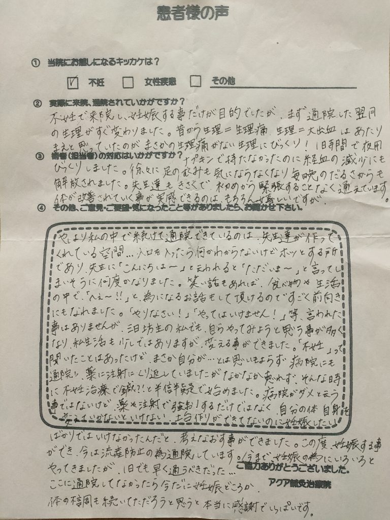 不妊で来院し、妊娠する事だけが目的でしたが、まず通院した翌月の生理がすぐ変わりました。昔から生理=生理痛、生理=大出血はあたりまえと思っていたのがまさかの生理痛がない生理にびっくり! 1時間で夜用ナプキンで持たなかったのに経血の減少にもびっくりしました。徐々に足のむくみも気にならなくなり毎晩のだるさからも解放されました。