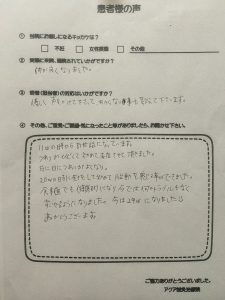 先生達もきさくで初めから緊張することなく通えています。体が改善されていく事が実感できるのはもちろん嬉しいですが、やはり私の中で続けて通院できているのは先生達が作ってくれている空間…入口を入ったら何かわからないけどホッとする所であり、先生に「こんにちは~」と云われると「ただいま~」と言ってしまいそうに何度かなりました。笑い話もあれば、食べ物や生活の中で「へぇ~!!」と為になるお話もして頂けるのですごく前向きにもなれました。「やりなさい!」「やってはいけません!」等、言われた事はありませんが、三日坊主の私でも自らやってみようと思う事が多くなり、私生活も少しではありますが、変える事ができました。