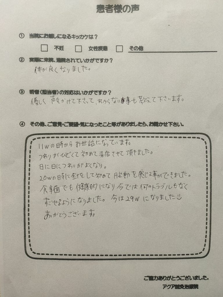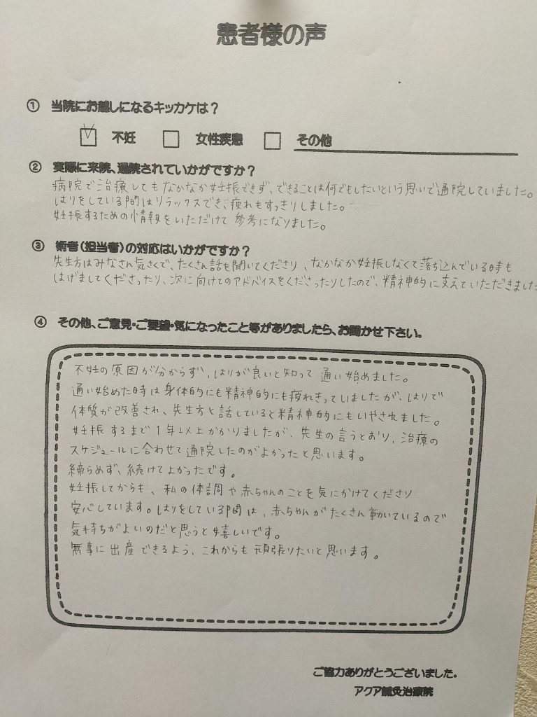 不妊の原因が分からず、はりが良いと知って通い始めました。通い始めた時は身体的にも精神的にも疲れきっていましたが、はりで体質が改善され、先生方と話していると精神的にもいやされました。妊娠するまで1年以上かかりましたが先生の言うとおり、治療のスケジュールに合わせて通院したのがよかったと思います。諦めず、続けてよかったです。妊娠してからも、私の体調や赤ちゃんのことを気にかけてくださり安心しています。はりをしている間は、赤ちゃんがたくさん動いているので気持ちがよいのだと思うと嬉しいです。無事に出産できるよう、これからも頑張りたいと思います。
