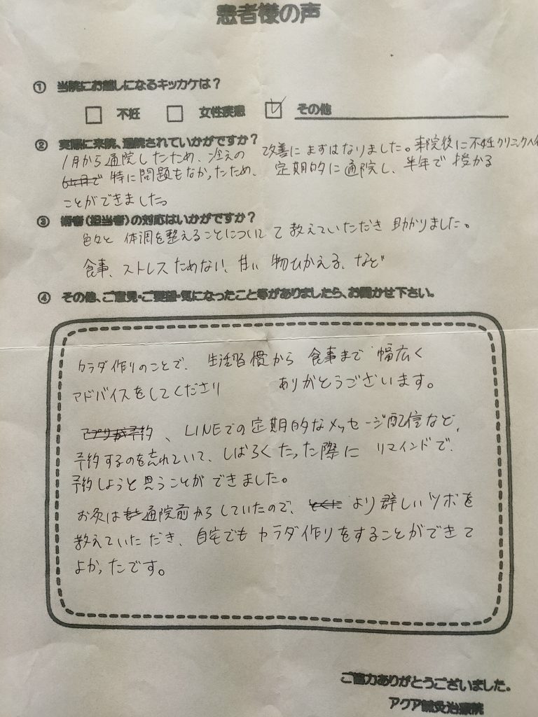 カラダ作りのことで生活習慣から食事まで幅広くアドバイスをしてくださりありがとうございます。LINEでの定期的なメッセージ配信など、予約するのを忘れていて、しばらくたった際にリマインドで予約しようと思う事ができました。お灸は通院前からしていたのでより詳しいツボを教えていただき、自宅でもカラダ作りをすることができてよかったです。