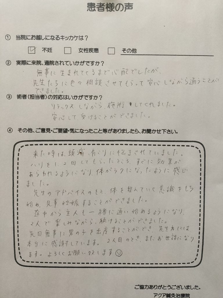 無事に産まれてくるまで心配でしたが、先生たちに色々相談させてもらって、安心しながら通うことが出来ました。リラックスしながら施術してくれました。安心して受けることが出来ました。来たときは、頭痛、肩こりに悩まされていました。ハリを1,2回してもらったところ、すぐに効果が現れるようになり、体が楽になったように感じました。先生のアドバイスのもと、体を整えて行く意識を持ち始め見事妊娠する事が出来ました。途中から主人も一緒に通い始めることになり二人で楽しみながら続けることが出来ました。先日、無事に男の子を出産することができ先生方には、本当に感謝しています。2人目の時、またお世話になります。宜しくお願い致します(^_^)