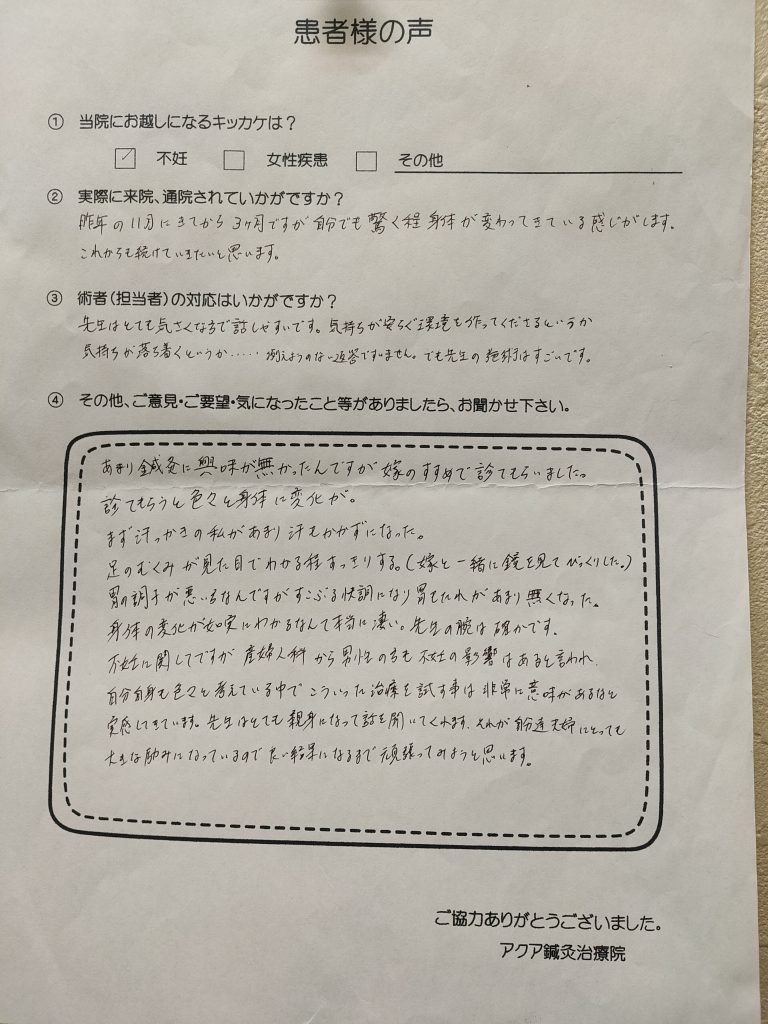 昨年の11月に来てから3ヶ月ですが自分でも驚くほど身体が変わってきている感じがします。先生はとても気さくな方で、話しやすいです。気持ちが安らぐ環境を作って下さるというか、気持ちが落ち着くというか・・・例えようのない返答ですいません。でも先生の施術はすごいです。あまり鍼灸には興味が無かったんですが、嫁のすすめで診てもらいました。診てもらうと色々と身体に変化が。まず汗っかきの私があまり汗をかかずになった。足のむくみが見た目で分かるほどスッキリする。(嫁と一緒に鏡を見てびっくりした)胃の調子が悪かったのですが、すこぶる快調になり胃もたれがあまり無くなった。身体の変化が分かるなんて本当にすごい。先生の腕は確かです。不妊に関してですが、産婦人科から男性の方も不妊の影響があると言われ、自分自身も色々と考えている中で、こういった治療を試すことは非常に意味があると実感してきています。先生は、とても親身になって話を聞いてくれます。それが自分たち夫婦にとっても大きな励みになっているので、良い結果になるまで頑張ってみようと思います。