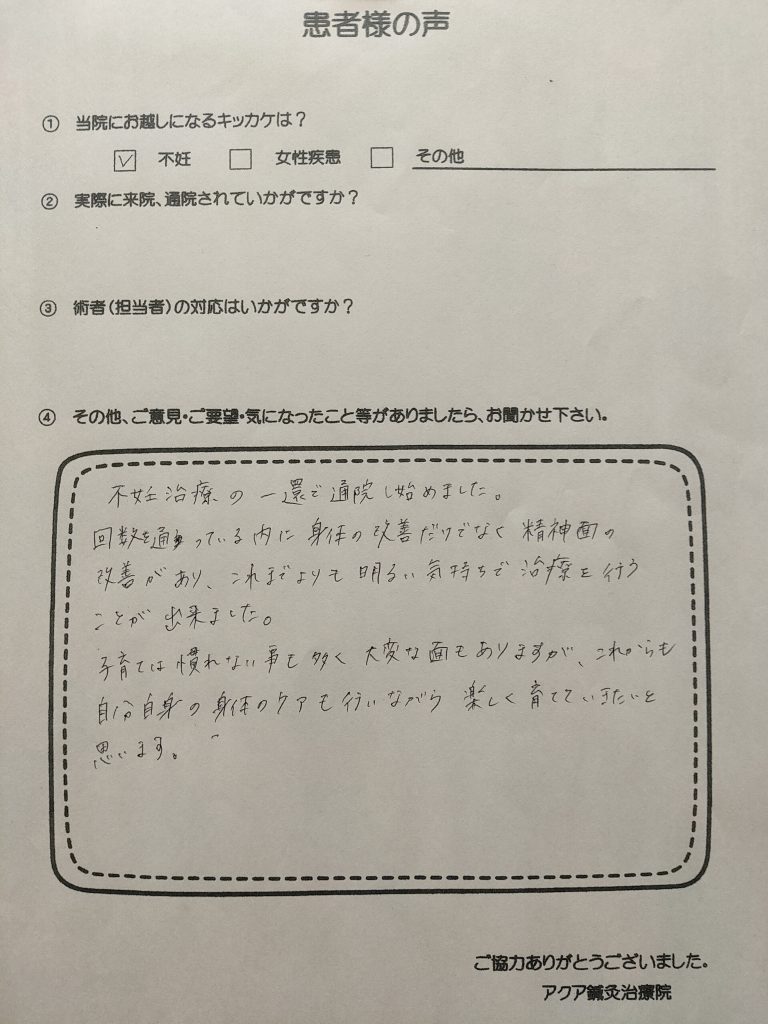 冷え性も改善し体力も付いてきて、無事に妊娠・出産出来ました。すごく丁寧で、相談も親身になって対応して頂きました。ありがとうございました。不妊で通いましたが、元々の冷えや体力が無いことも治療して頂くにつれて改善しました。不妊のことは周りの人に相談できなかったのですが、ここに来て相談できて、すごく助かりました。通い始めて9ヶ月で妊娠し無事元気な男の子を出産しました。ありがとうございました。