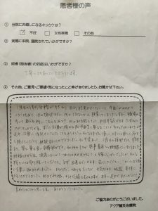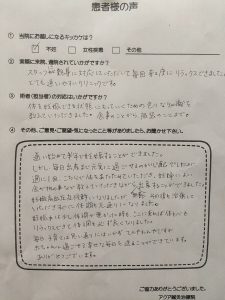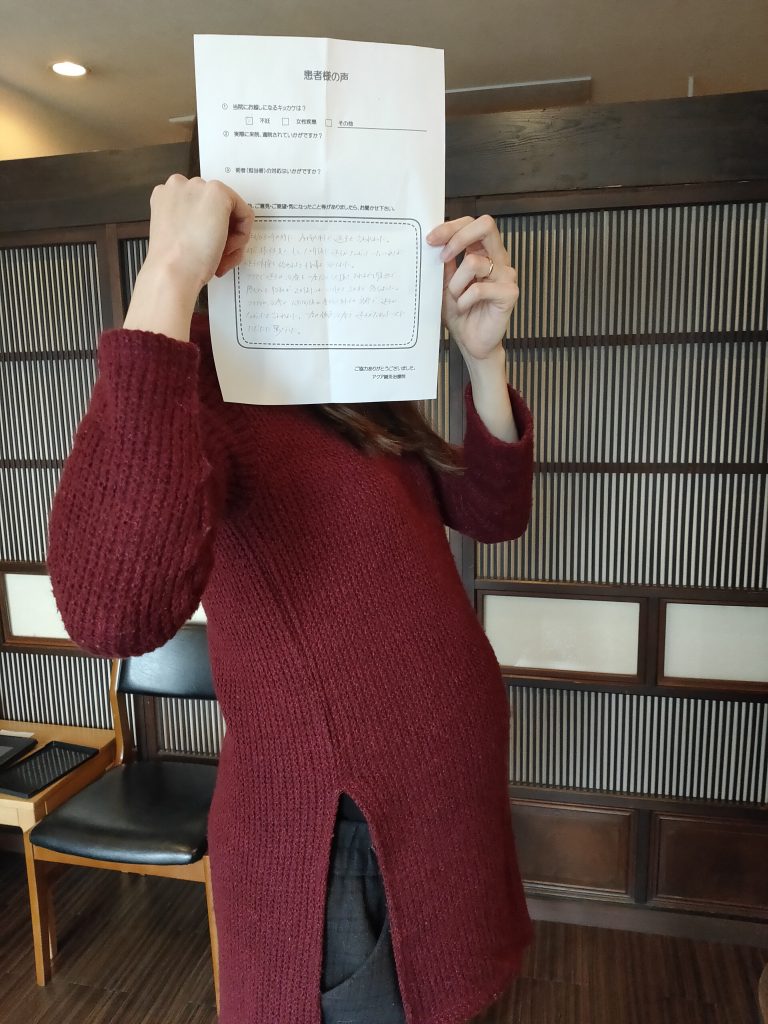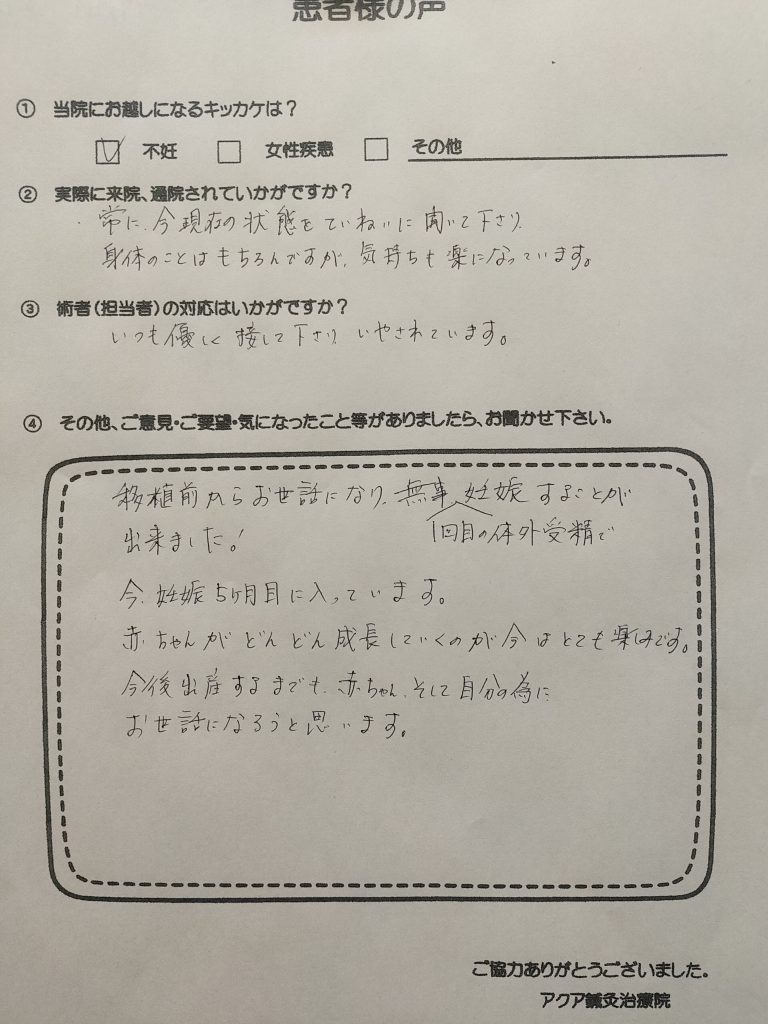 この度は、ご報告ありがとうございました。おめでとうございます!!(^_^)ちょうど一年前に、ご夫婦で治療に来られ一昨日に出産されました。ご主人様立ち会いの出産でした。ご主人様も、妊活に参加されタバコもやめられたぐらい真剣に取り組まれたのが良かったと思います。本当におめでとう!!(^_^)また、ご家族でお越しになられるそうです。楽しみにしています(^_^)