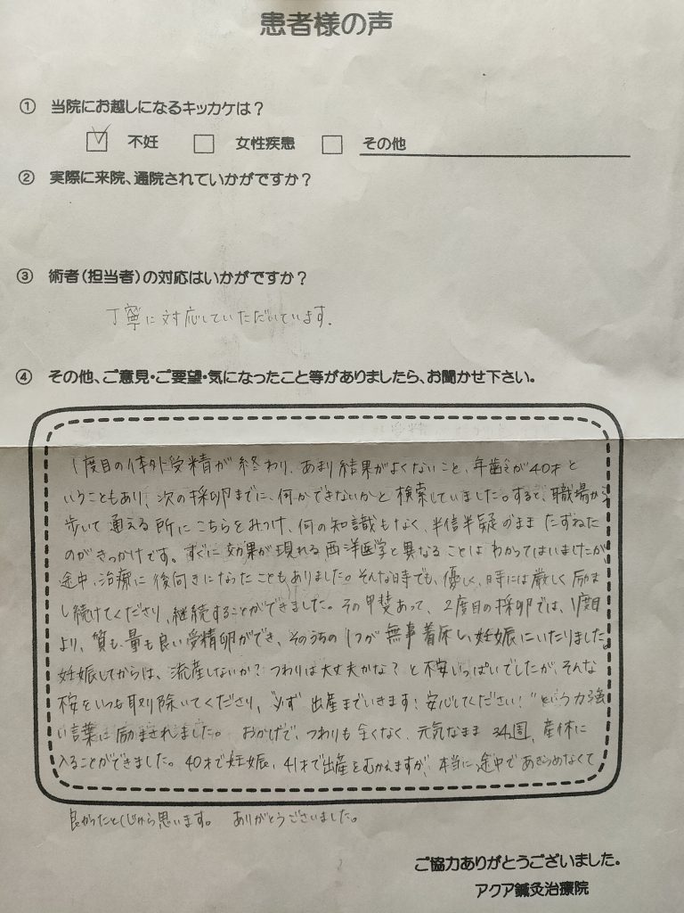 一度目の体外受精が終わり、あまり結果が良くないこと、年齢が40才と言うこともあり次の採卵までに、何か出来ないかと検索していました。すると、職場から歩いて通えるところに、こちらを見つけ何の知識も無く半信半疑のまま訪ねたのがきっかけです。すぐに効果が現れる西洋医学と異なることは分かっていましたが途中治療に後ろ向きになったこともありました。そんな時でも、優しく時には厳しく励まし続けてくださり継続することが出来ました。その甲斐あって、2度目の採卵では1度目より質も量も良い受精卵ができそのうちの1つが無事着床し妊娠に至りました。妊娠してから流産しないか?つわりは大丈夫かな?と不安いっぱいでしたが、そんな不安をいつも取り除いてくださり必ず出産までいきます。安心してください。と言う力強い言葉に励まされました。おかげで、つわりも全くなく、元気なまま34週、産休に入ることが出来ました。40才で妊娠、41才で出産を迎えますが、本当に途中で諦めなくて良かったと心から思います。ありがとうございました。