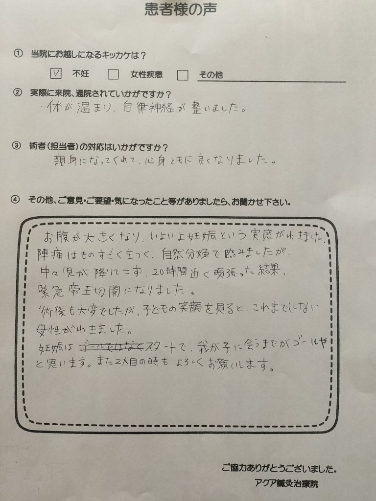 体が温まり自律神経が整いました。親身になってくれて心身共に良くなりました。お腹が大きくなり、いよいよ妊娠という実感がわきました。陣痛はものすごくきつく、自然分娩で挑みましたが中々、胎児が降りてこず20時間近く頑張った結果緊急帝王切開になりました。術後も大変でしたが、子供の笑顔を見ると、これまでにない母性がわきました。妊娠はスタートで、我が子に会うまでがゴールやと思います。また2人目の時は、よろしくお願いします。