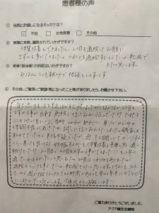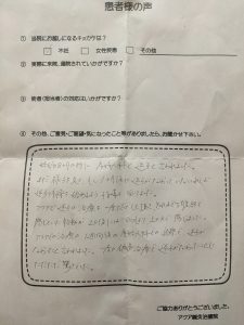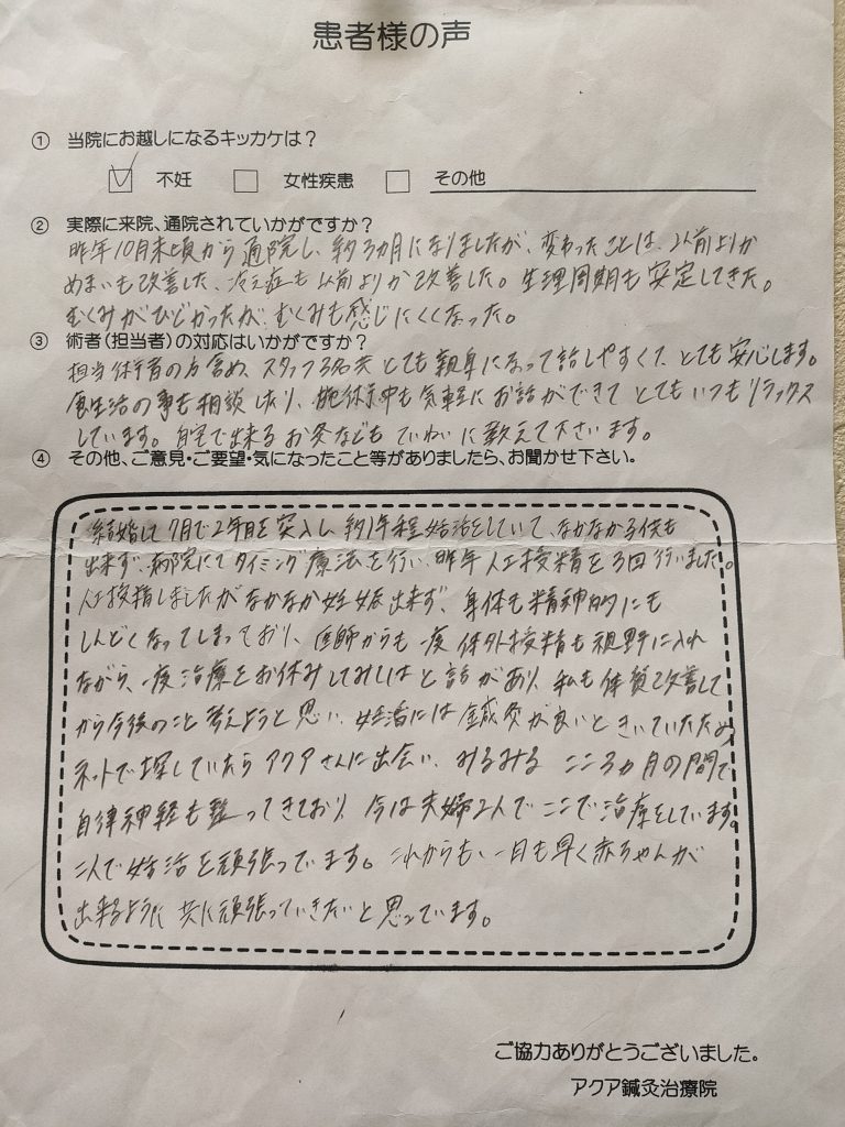 昨年10月頃から通院し約三ヶ月になりましたが、変わったことは以前よりめまいも改善した。冷え性も以前より改善した。生理周期も安定してきた。むくみもひどかったが、むくみも感じにくくなった。担当者の方も含め、スタッフ3名共とても親身になって話しやすくて、とても安心します。食生活のことも相談したり、施術中も気軽にお話が出来て、とてもいつもリラックスしています。自宅で出来るお灸等も、丁寧に教えてくださいます。結婚して7月で2年目に突入し約1年ほど妊活をしていて、なかなか子供も出来ず病院にてタイミング療法を行い昨年、人工授精を3回も行いました。人工授精しましたが、なかなか妊娠出来ず身体も精神的にもしんどくなってしまっており医師からも一度体外受精も視野に入れながら一度治療をお休みしてみてはと話があり、私も体質改善してから今後のこと考えようと思い妊活には鍼灸が良いと聞いていたためネットで探していたらアクアさんに出会いみるみる3ヶ月間で自律神経も整ってきており、今は夫婦2人で、ここで治療をしています。2人で妊活を頑張っています。これからも、一日も早く赤ちゃんが出来るように共に頑張って行きたいと思います。