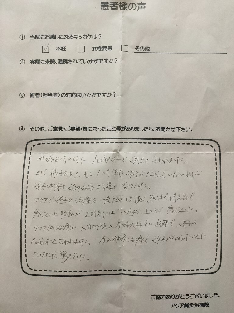 妊娠8ヶ月目の時に、産婦人科で逆子と言われました。まだ様子を見て、もし1ヶ月後に逆子が治っていなければ逆子体操を始めよう指導を受けました。アクアで逆子の治療を一度だけして頂き、それまで下腹部で感じていた胎動が、二日後には、いつもより上の方で感じました。アクアでの治療の1週間後の産婦人科での診察で逆子が治ったと言われました。一度の鍼灸治療で、逆子が治ったことに、ただただ驚きでした。