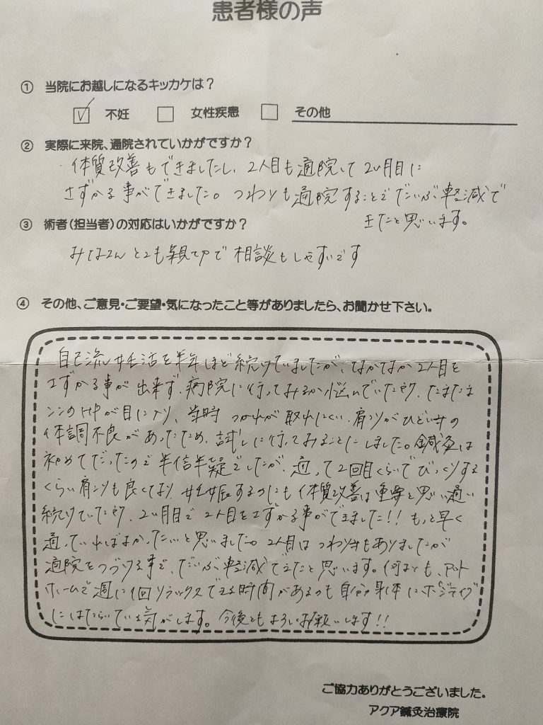 体質改善も出来ましたし、2人目も通院して2ヶ月目に授かることが出来ました。つわりも通院することで、だいぶ軽減できたと思います。みなさん、とても親切で相談もしやすいです。自己流妊活を半年ほど続けていましたが、なかなか2人目を授かることが出来ず病院に行ってみるか悩んでいたところ、たまたまここのHPが目に入り当時、疲れが取れにくい肩こりがひどく体調不良があったため試しに行ってみることにしました。鍼灸は初めてだったので、半信半疑でしたが通って2回目ぐらいでびっくりするぐらい肩こりも良くなり妊娠するのにも体質改善は重要と思い続けていた所、2ヶ月目で2人目を授かることが出来ました。もっと早く通っていれば良かったと思いました。2人目は悪阻(つわり)もありましたが、通院を続けることでだいぶ軽減できたと思います。何よりもアットホームで週1回リラックスできる時間があるのも自分の身体にポジティブにはたらいている気がします。今後とも、よろしくお願いします。