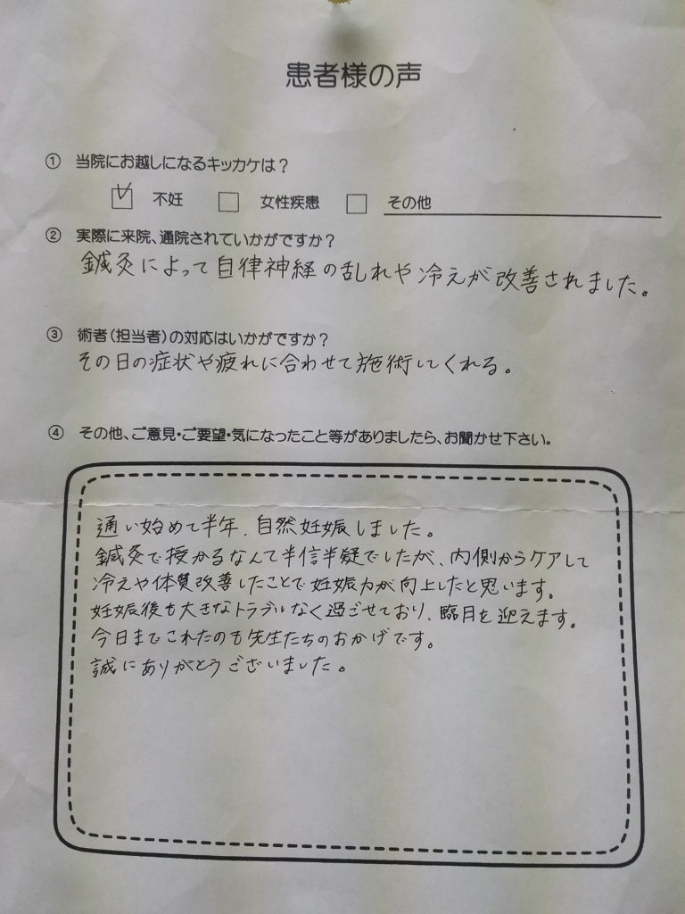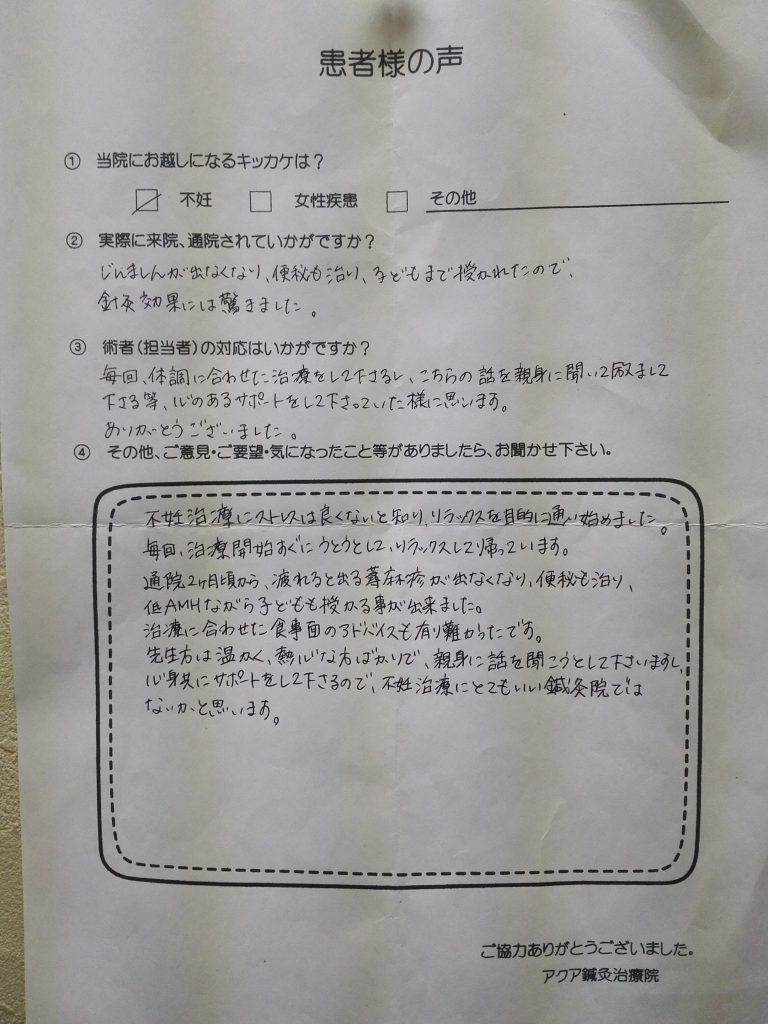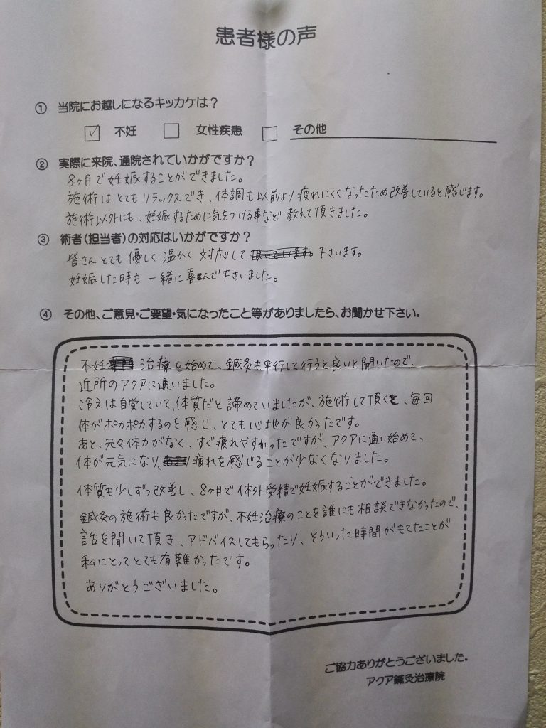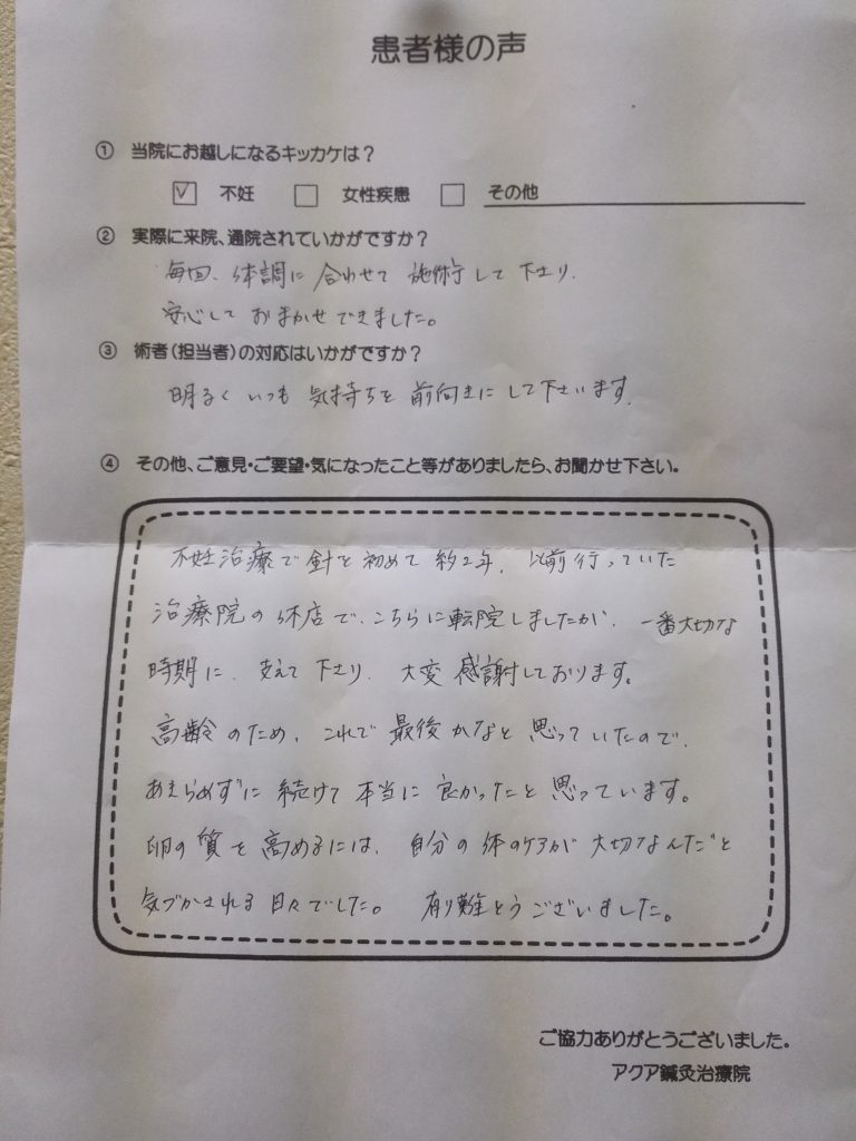 不妊治療で鍼を初めて約2年。以前行っていた治療院の休院で、こちらに転院しましたが一番大切な時期に支えてくださり大変感謝しております。高齢のため、これで最後かなと思っていたのであきらめずに続けて本当に良かったと思っています。卵の質を高めるには、自分の体のケアが大切なんだと気付かされる日々でした。有難うございました。