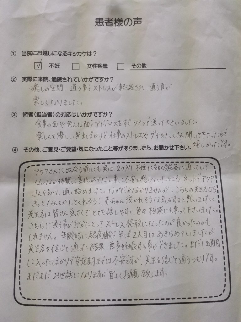 アクアさんに出会う前にも、実は2カ所不妊に効く鍼灸院に通っていて、なかなか体質に変化が出ないことに不安に感じていたところネットでアクアさんを知り通い始めました。なぜだか分かりませんが、こちらの先生ならきっとなんとかしてくれそう!!赤ちゃん授かれそうな気がすると思いました。先生方は気さくで、とても話しやすく色々相談にも乗ってくださいました。こちらに通うことが自分にとってストレス発散になったのが良かったのかも知れません。年齢的に超高齢で、半ば二人目は諦めていましたが先生方を信じて通った結果、無事妊娠する事が出来ました。まだ、12週目に入ったばかりで安定期までは不安ですが、先生方を信じて通うつもりです。まだまだお世話になりますが宜しくお願い致します。