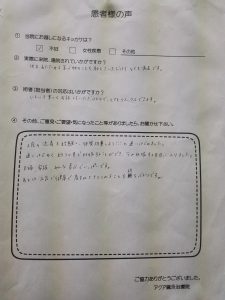 31週目で来院しました。きっかけは、ネットで知り逆子の成功率が80%以上だったこともあり来院しました。逆子もあったせいかイライラしたり食べ過ぎもありましたが鍼灸を受けてから楽になった感じがあり検査へ行くと元に戻っていました。本当に凄いと感じ、また元に戻るのが嫌なので出産までお世話になるつもりです。