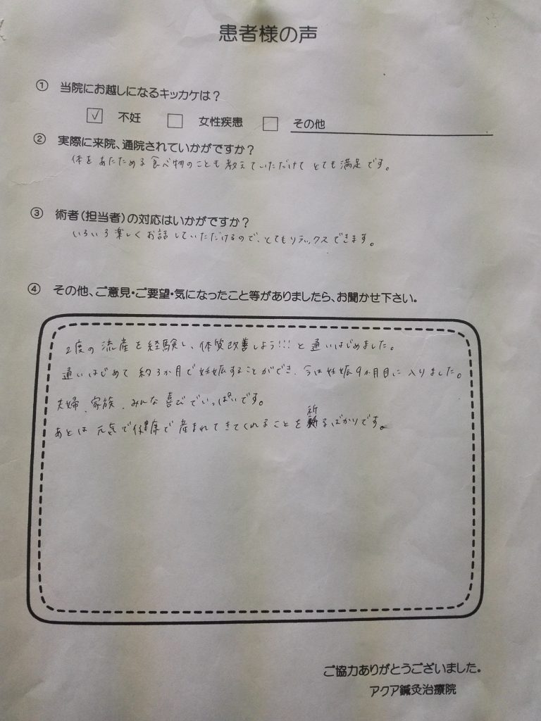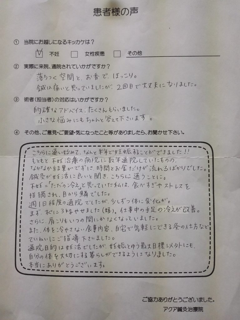 不妊治療を初めて2年。体外受精にステップアップする際に、アクア鍼灸治療院に通院を始めました。一度の体外受精、採卵数は1つ移植に至るも着床すらしない結果にずいぶん落ち込みました。今思えば冷えなどで血流の悪さに対する鍼灸治療を始めたばかりで、まだまだ改善途中だったと思います。焦るばかりの気持ちや不妊治療に対する愚痴など先生は「わかるわかる」と傾聴してくださり、気持ちが軽くなっていました。また、日常生活で気を付けること漢方を取り入れてみる事などアドバイスを頂き、じっくり体質改善し体と向き合う大切さに気づかせていただきました。通院し始めて4ヶ月。すっかり体調も良い状況となり、次の生理周期で再び体外受精の準備に入ろうとしていた矢先、まさかの自然妊娠が発覚しました。陽性反応が出た事を先生に伝えると「やったー」と一緒に喜んで貰えたのがとても嬉しかったです。本当に感謝です。ありがとうがとうございます。現在妊娠三ヶ月です。お陰様で悪阻も軽く順調です。まだ安定しないので引き続きアクア鍼灸治療院にお世話になる予定です。宜しくお願いします。