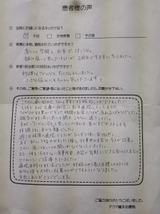結婚後子どもが欲しかったのですが、なかなか妊娠できませんでした。産婦人科で調べてもらうと、AMH値が実年齢より低く、不妊治療を始めることになりました。不妊治療がなかなか上手くいかず精神的に疲れてしまい、肩が張ったり体がだるくなっていきました。そんな時、アクア鍼灸治療院で体の調子を整えてもらい、徐々に体調が良くなってきて、今まで感じていたストレスも無くなっていきました。そしてしばらくしてから、、、やっと妊娠することが出来ました。鍼をしてもらっている時に、食事面でもアドバイスを頂いたこともありました。悩み事を聞いてもらったり、丁寧に対応してもらえます。施術してもらった後は、いつも体が軽くなりとても気持ちが良いです。これから出産を迎えるので、また体調を整えてもらうために是非行かせてもらおうと思っています。先生方にとても感謝しています。