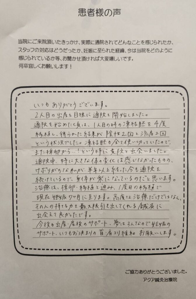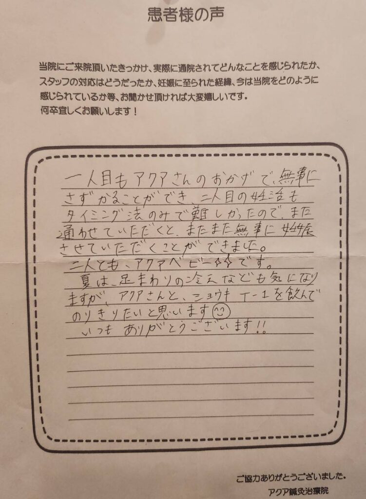 1人目もアクアさんのおかげで無事に授かることができ、二人目の妊活もタイミング法のみで難しかったので、また通わせていただくと、またまた無事に妊娠させていただくことができました。